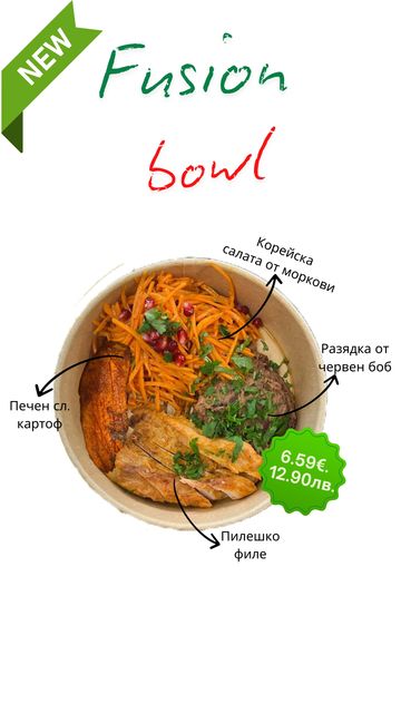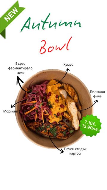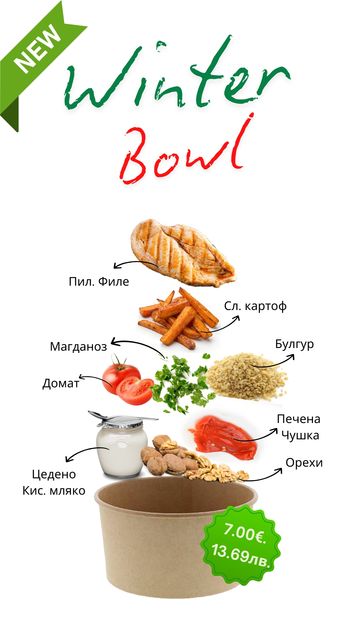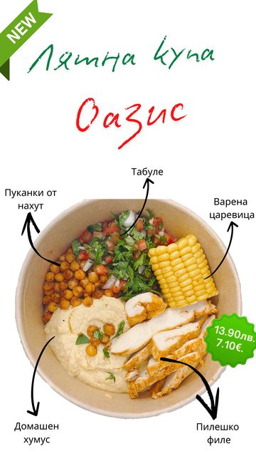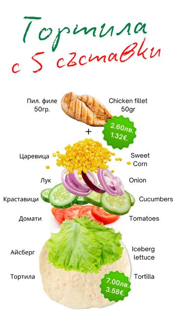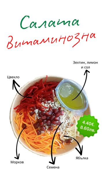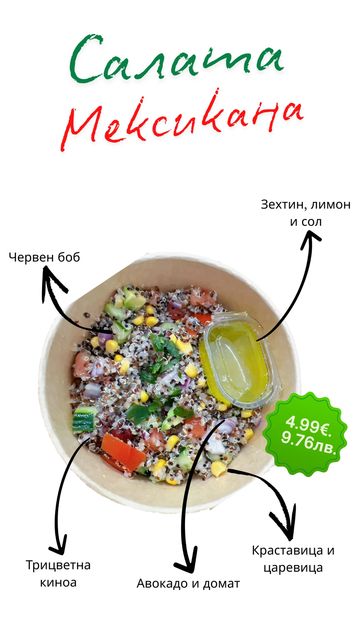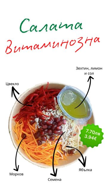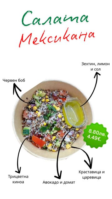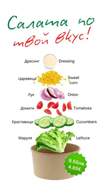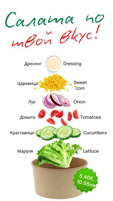 Зеленчуци по ваш избор от нашата витрина. Добавете и пил. филе, дърпано телешко или риба тон.