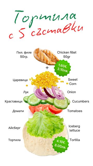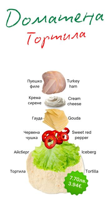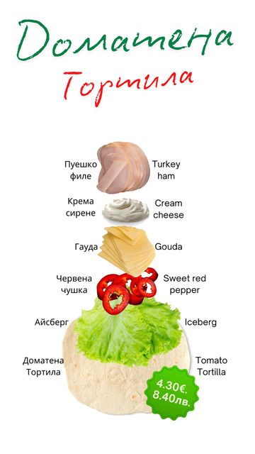 Доматена тортила, крема сирене, айсберг, гауда, пуешко филе и чушка.