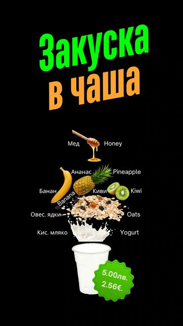 Кисело мляко, овесени ядки, плод (банан, ягода, боровинки, ананас или малини) и мед.