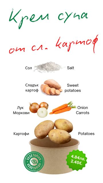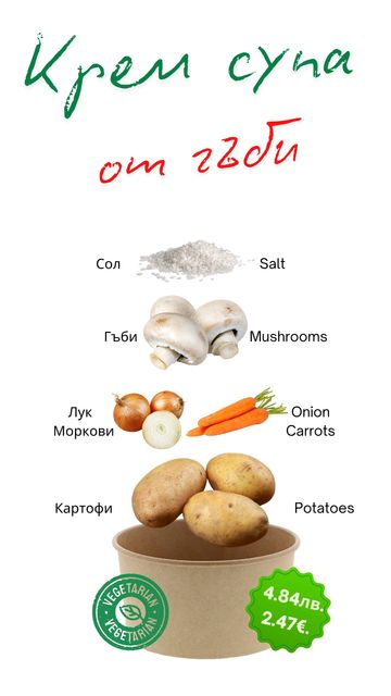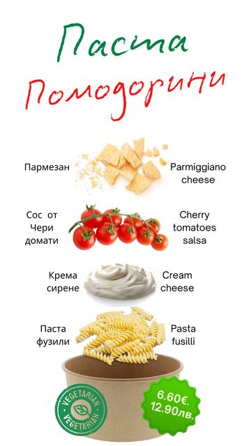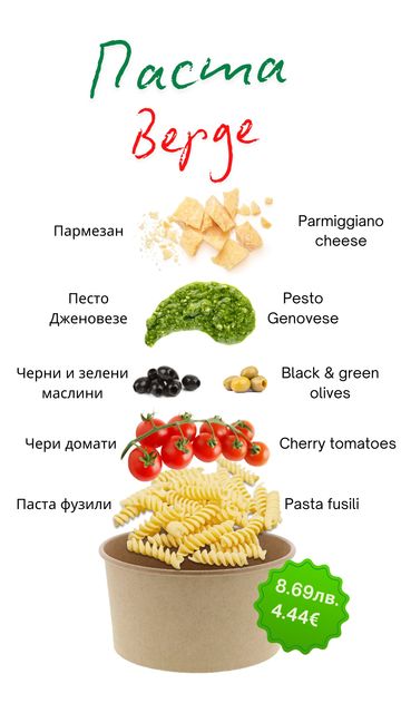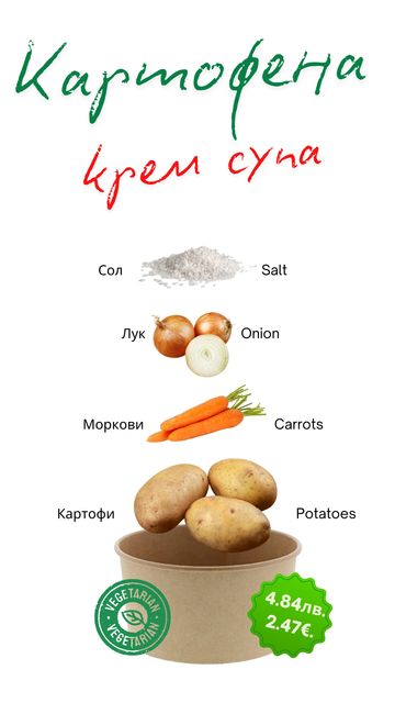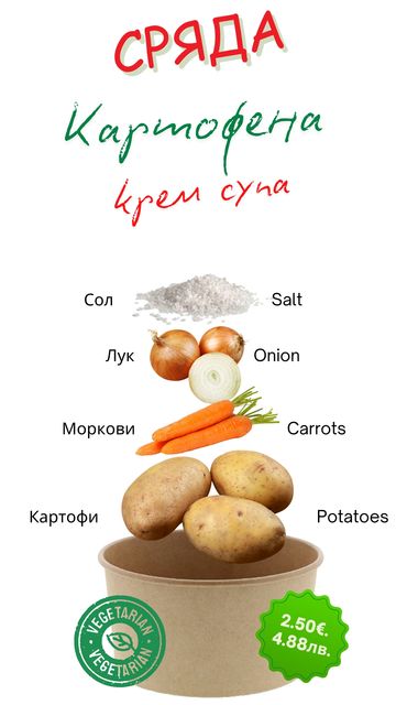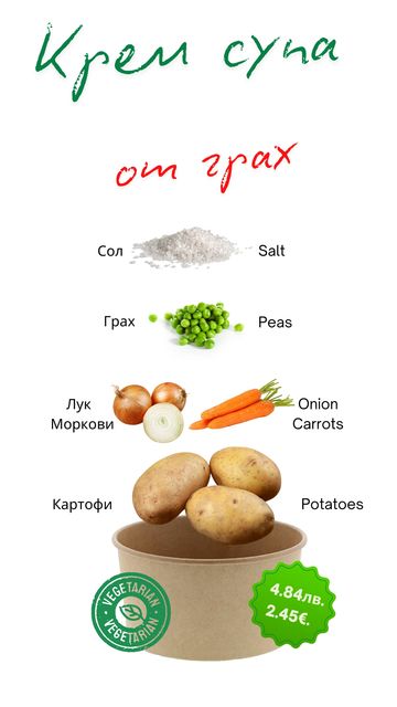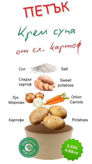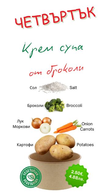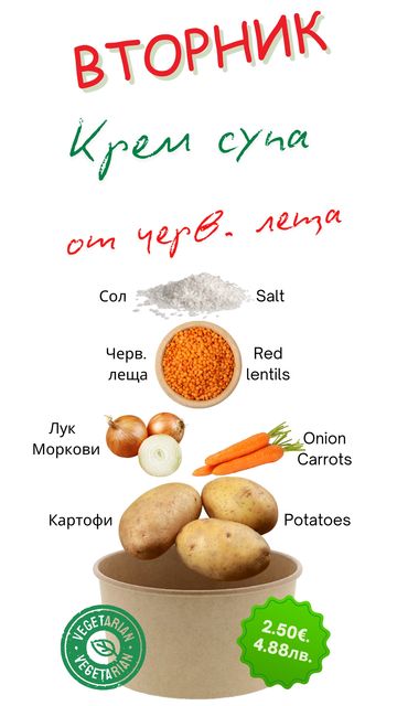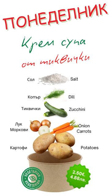 Всеки ден приготвяме по един вид супа и основно. Нашето меню е съобразено със сезонното разнообразие от плодове и зеленчуци. За точна информация посетете нашата страница във фейсбук или се обадете на телефон +359 879 377 947.