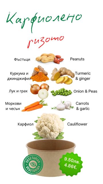Карфиол, моркови, чесън, лук, грах, куркума, джинджифил и фъстъци.