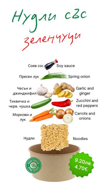 Нудли, тиквичка, морков, лук, чушка и сусам.