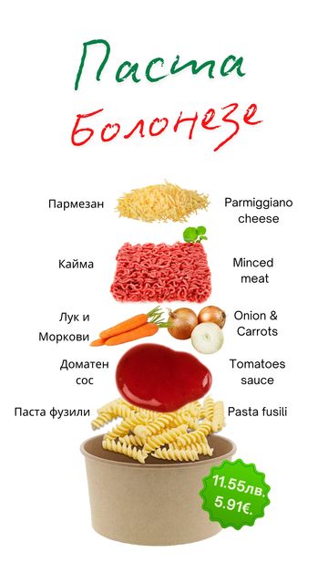 Фузили, доматен сос, моркови, лук, кайма, и пармезан.