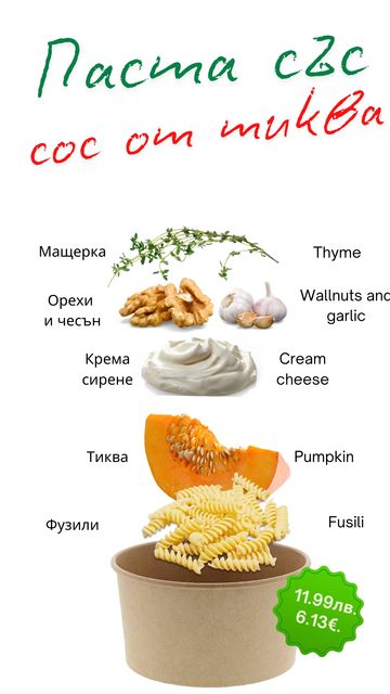 Фузили, тиква, крема сирене, орехи, чесън и мащерка.