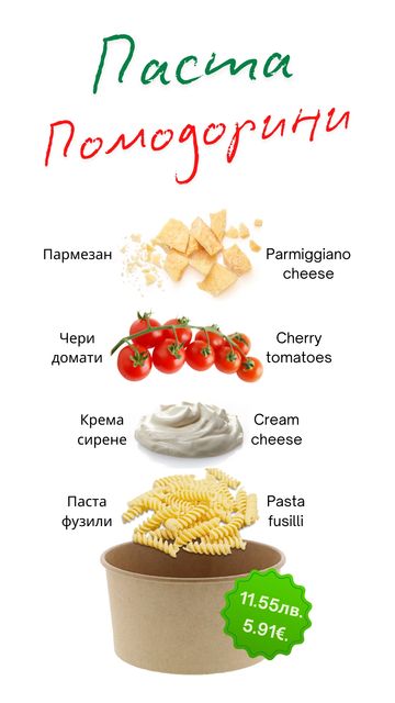 Паста фузили или пенне, чери домати, крема сирене, лук, пармезан и зелени маслини.