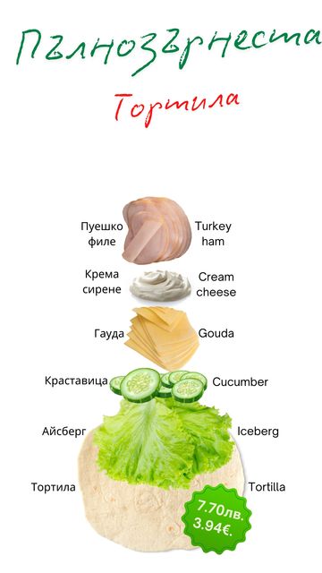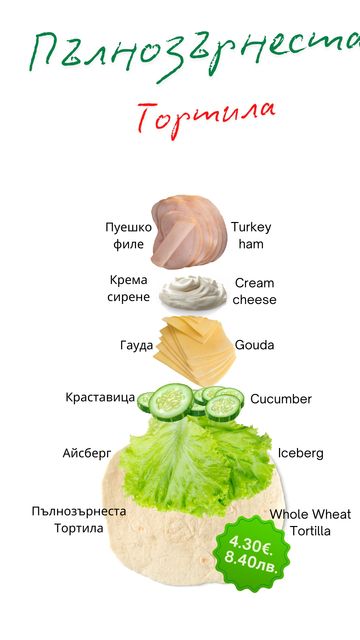 Пълнозърнеста тортилa, крема сирене, айсберг, пуешко филе, гауда и краставица.
