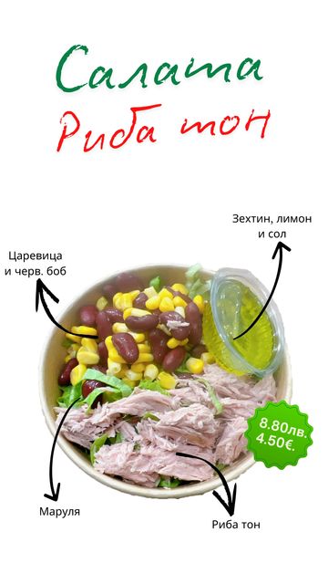 Маруля, царевица, червен боб, риба тон, дресинг от зехтин, лимон и сол.