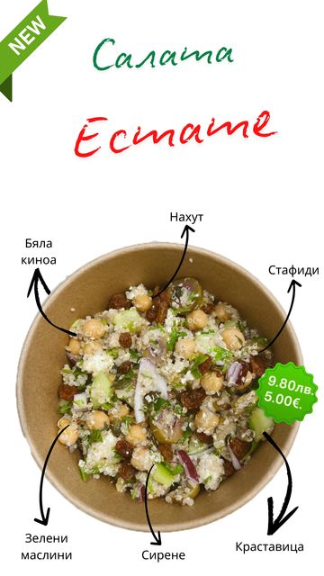 Бяла киноа, нахут, стафиди, зелени маслини, сирене, краставица, копър, магданоз и микс семена.
