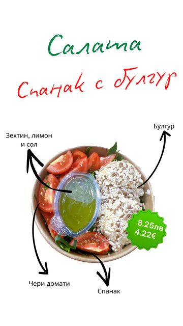 Спанак, булгур, чери домати и семена, дресинг от зехтин, лимон и сол.