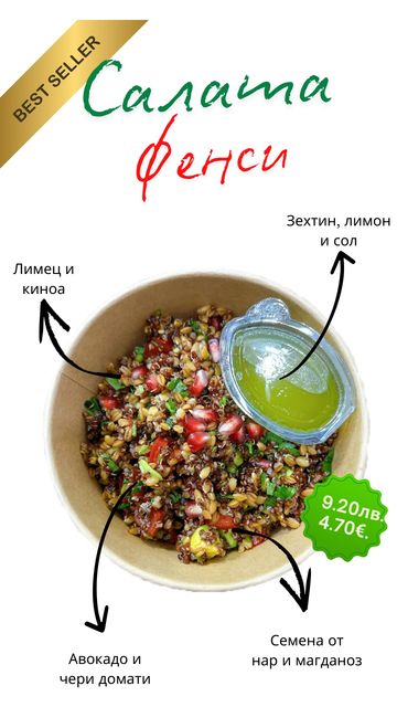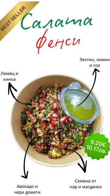 Лимец, киноа, авокадо, чери домати, семена от нар, магданоз, дресинг от зехтин, лимон и сол.