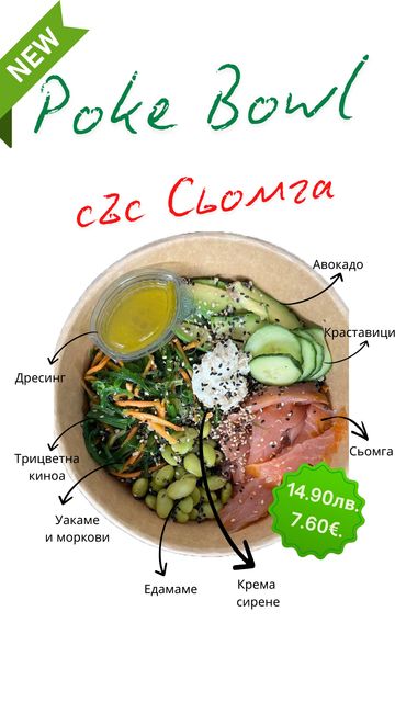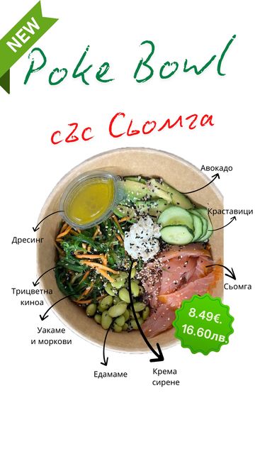 Дресинг, трицветна киноа, уакаме, моркови, едамаме, крема сирене, сьомга, краставици, авокадо.