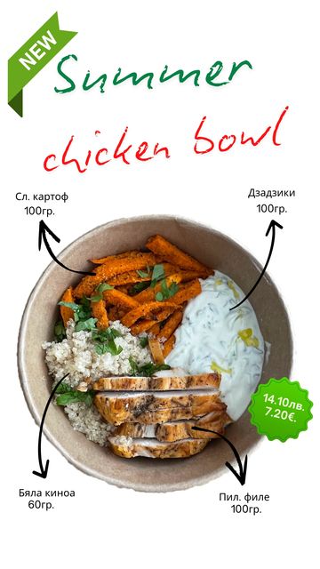 Сладък картоф, бяла киноа, пил. филе и дзадзики.