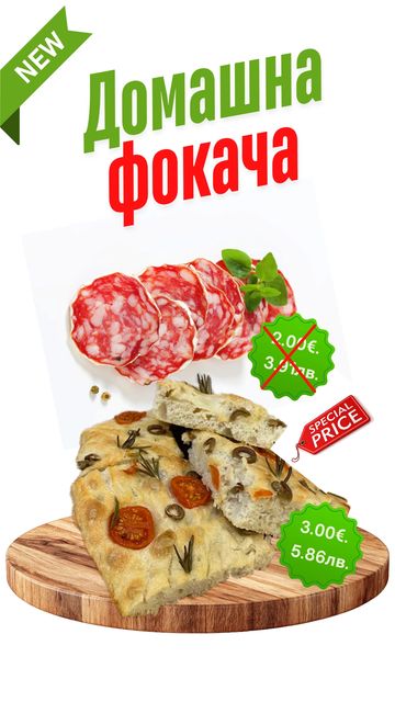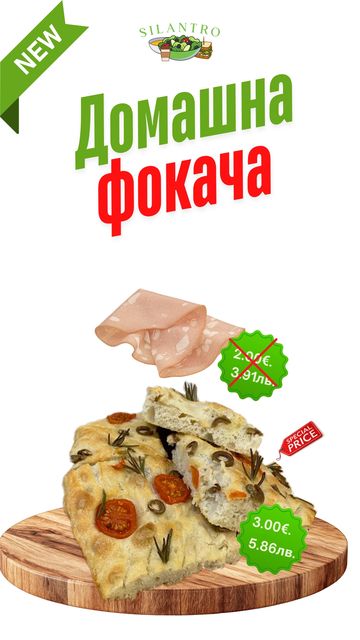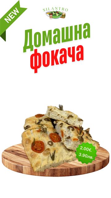 Домашна фокача със зехтин, розмарин, чери домати и зелени маслини. По желание на клиента може да се добави и италиански колбас.