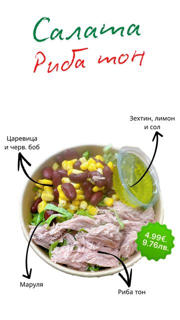 Избери 5 съставки от нашата витрина и си направи салата по твой вкус. Избери и месо между пил. филе, дърпано телешко и риба тон.